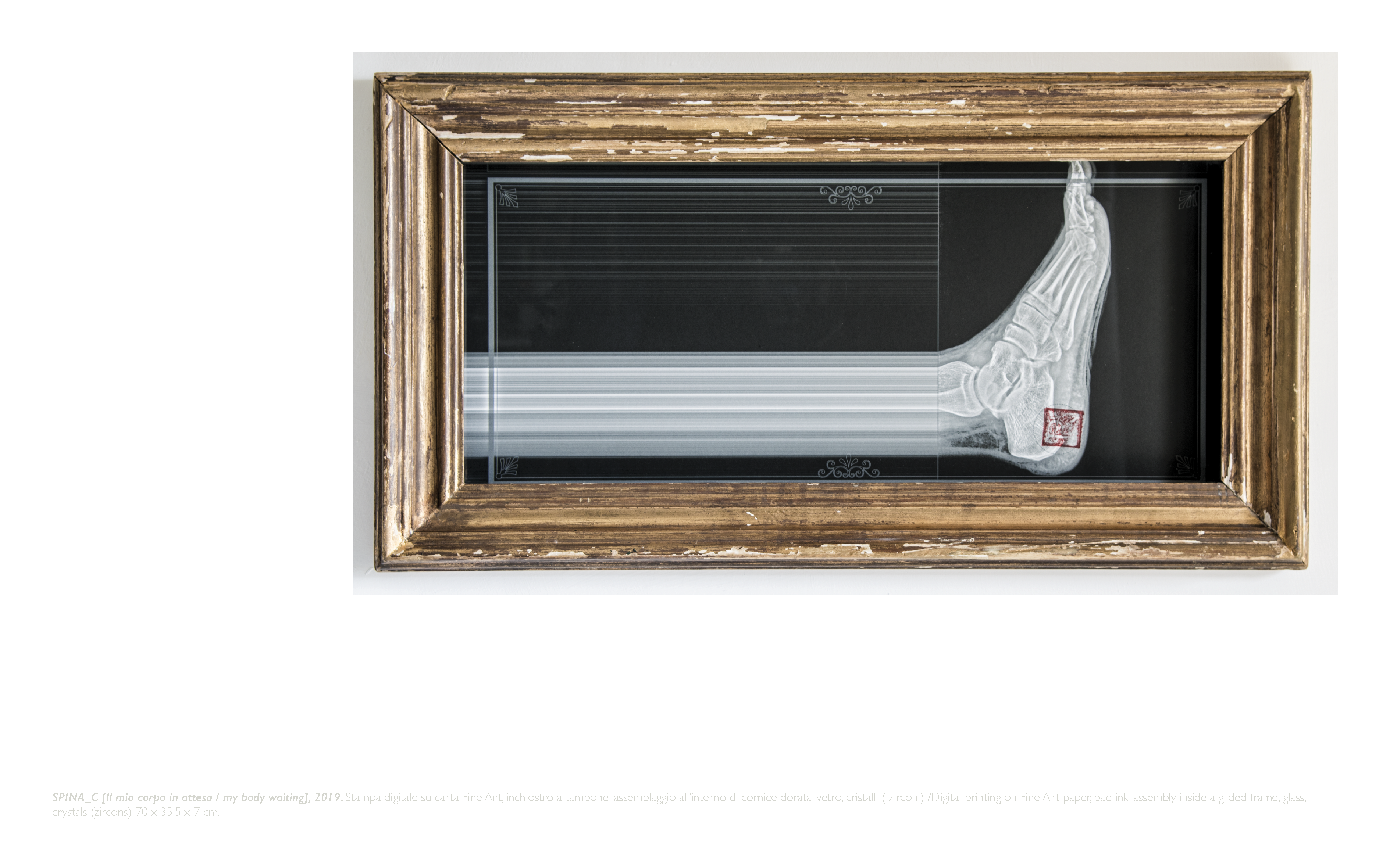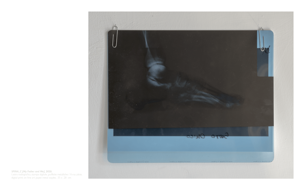 L’opera evidenzia attraverso l’artifizio della post-produzione fotografica, l’estensione anomala(in orizzontale)dell’arto inferiore radiografato, affetto da spina calcagnale nel tallone, nel tentativo effimero di formalizzare visivamente l’autoritratto di una protuberanza calcificata sottocutanea, come segno distintivo invisibile.