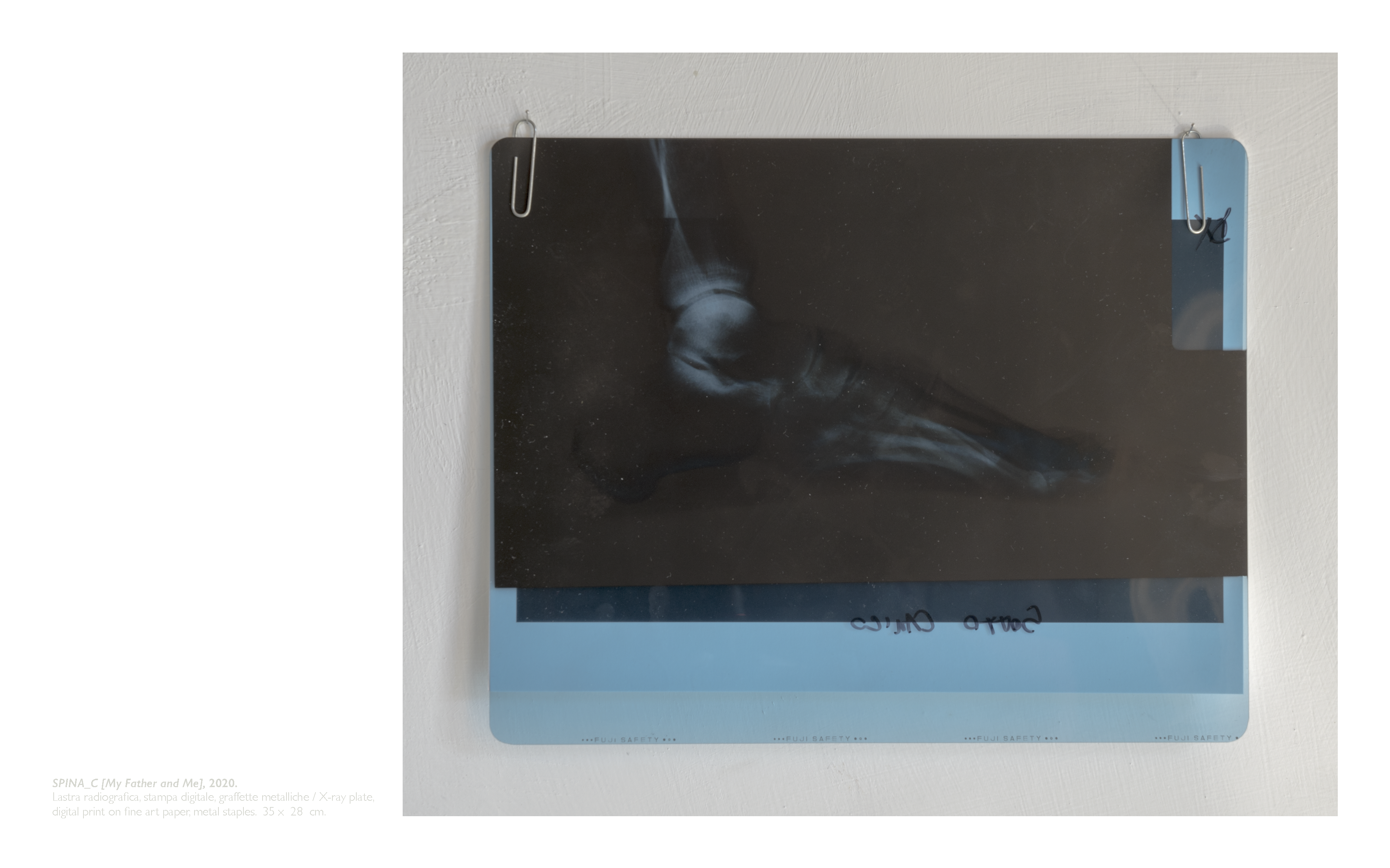 The work highlights through the artifice of photographic post-production, the anomalous extension (horizontally) of the radiographed lower limb, affected by heel heel, in the ephemeral attempt to visually formalize the self-portrait of a subcutaneous calcified protuberance, as an invisible hallmark.